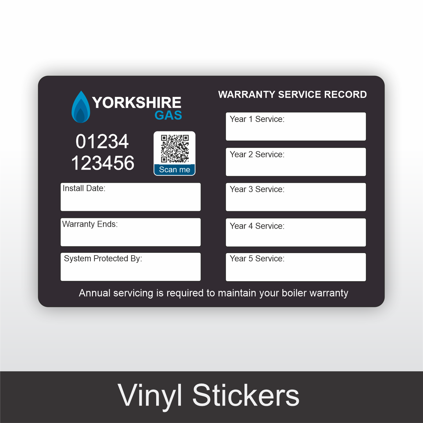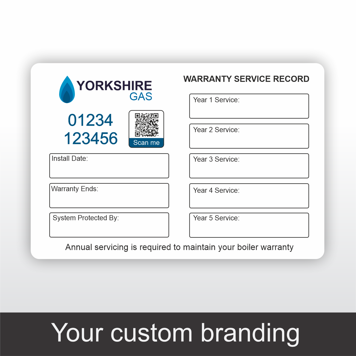 For use on the front of a such as a boiler or unvented cylinder to keep track of servicing intervals. A great way to form a reminder for a customer to have annual servicing work completed. Your contact details and branding is also included to give a good professional impression to your customers.